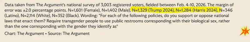A pundit who is considered a leading source of analysis on polling posting anything with the glaring issues cited above is unconscionable. Doing it under a headline that says: “The trans rights backlash is real”, and basically advocating real harm against the transgender minority that authoritarians in and around the White House have already declared intent to harm, knowing it’s likely they will use your words to justify said harm? In a just world, that would be career-ending.